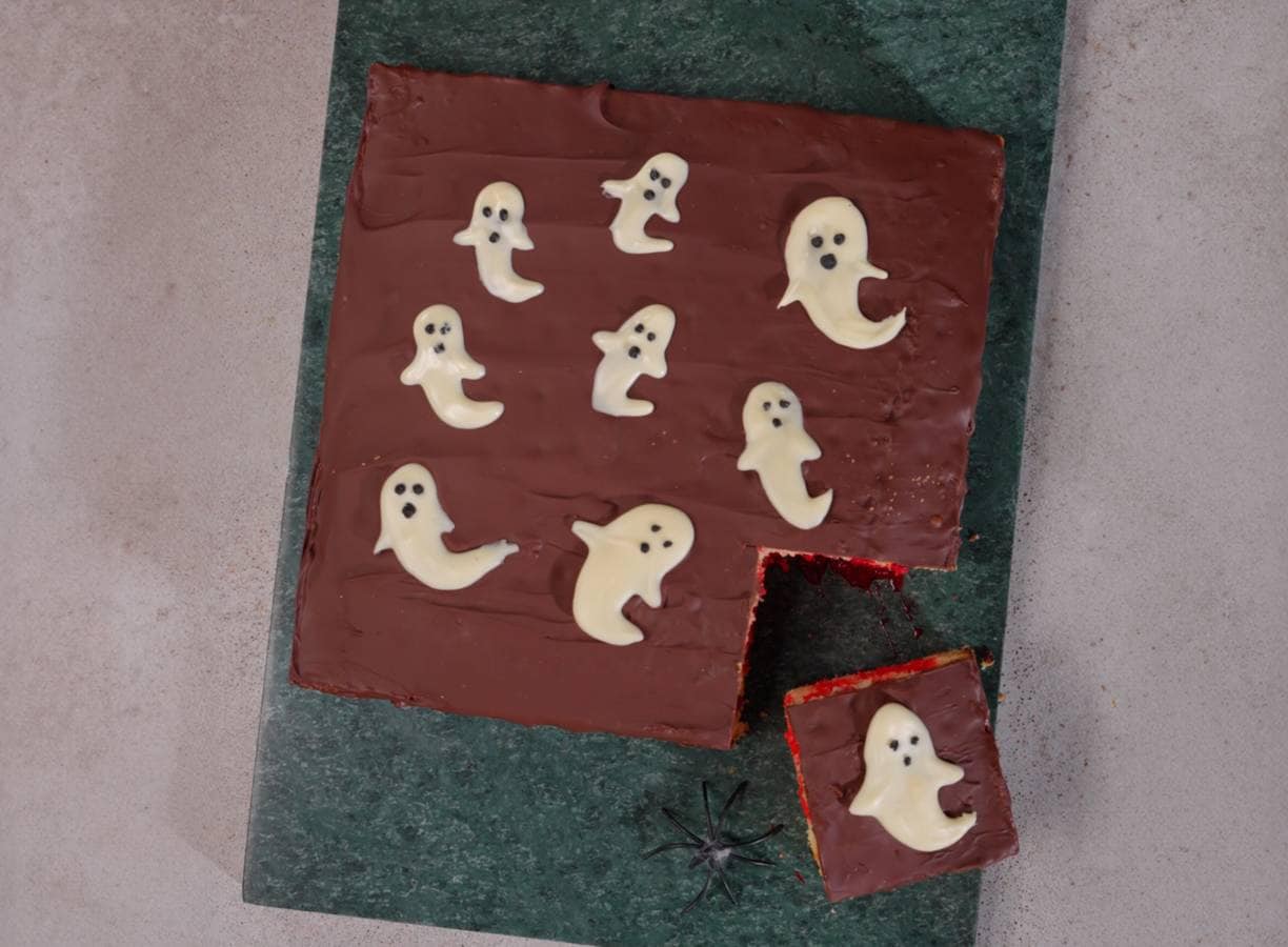 Tijd om te griezelen! Maak deze Halloween cake gedecoreerd met chocolade spookjes en een 'bloederige' surprise aan de binnenkant.