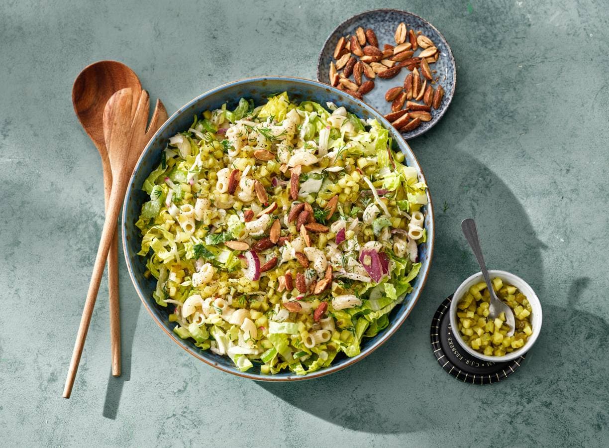 Snijd de romainesla in dunne reepjes en hak de amandelen grof. Meng de pasta met het spreadmengsel en vervolgens met de romainesla, rauwkost radijs en augurkenblokjes. Breng op smaak met peper en eventueel zout. Verdeel over een schaal en bestrooi met de amandelen.