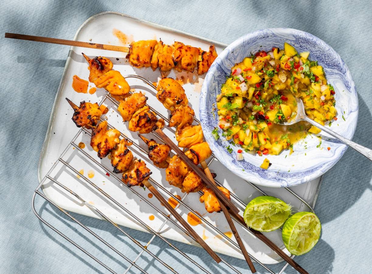 Kipspiesjes met gegrilde-mangosalsa van de BBQ