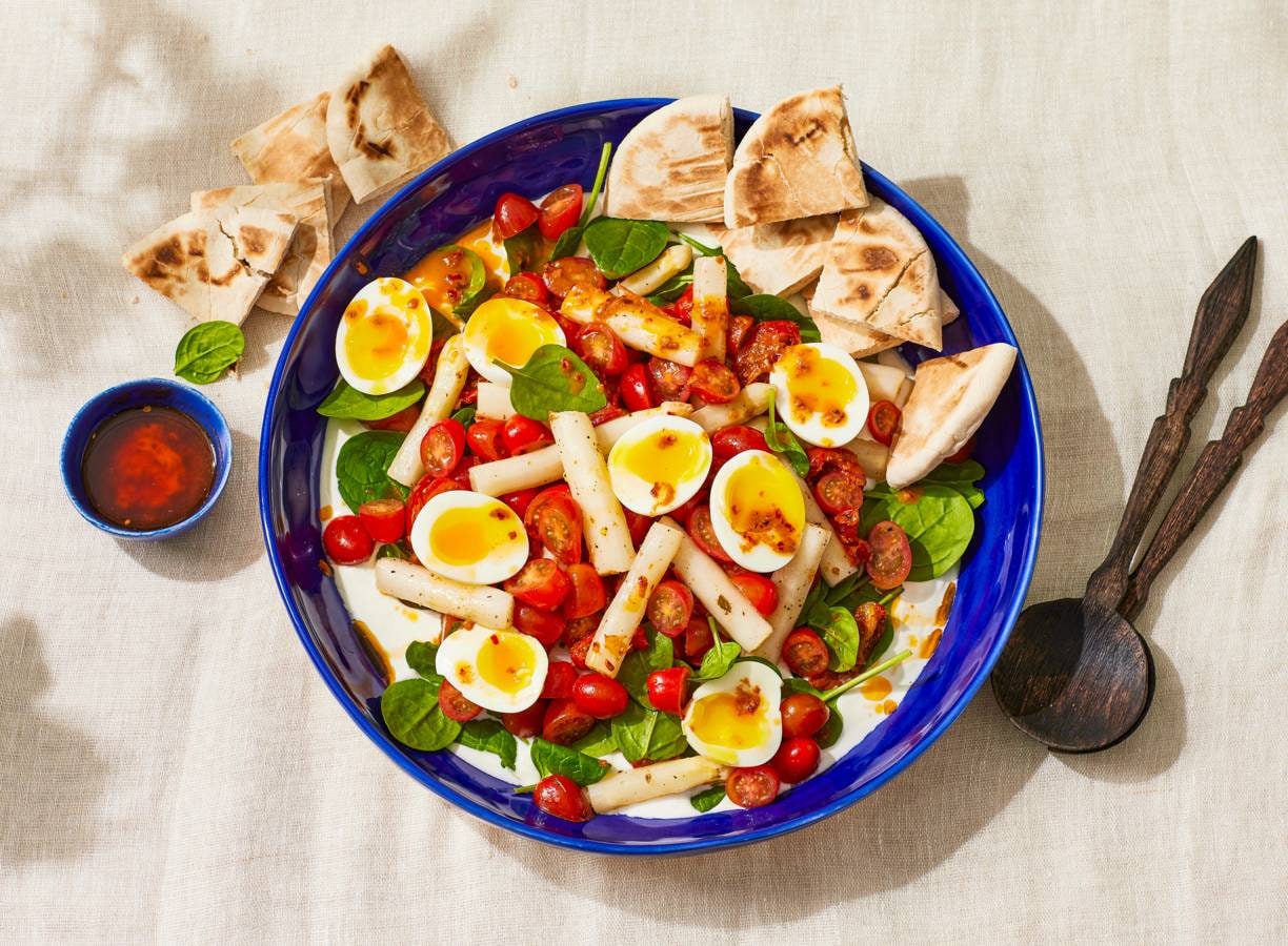 Salade met asperges, ei en knoflookyoghurt van London Loy