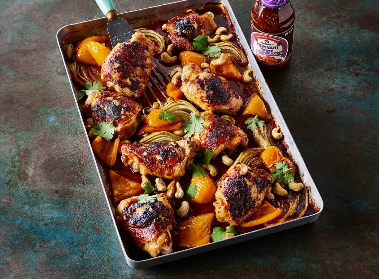 Haal de bakplaat uit de oven, voeg de paprika (in grove stukken gesneden) en teriyakisaus toe en meng alles goed. Zet nog eens 25 minuten in de oven. Voeg na 15 minuten de cashewnoten toe.