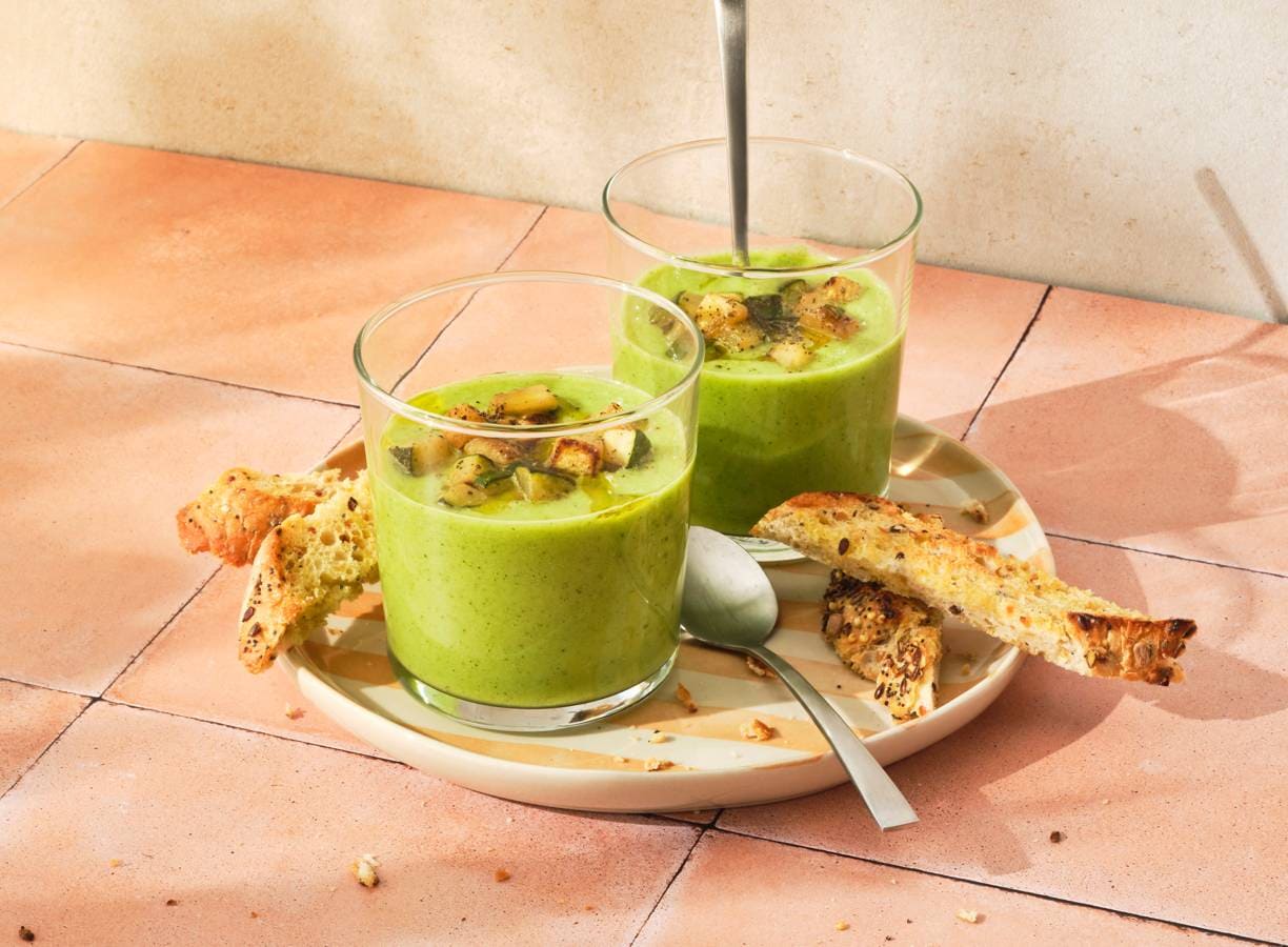 Deze Spaanse, frisse gazpacho van courgette, knoflook en koriander is makkelijk vooraf te maken. Eet daar een knapperig, geroosterd broodje bij en geniet!