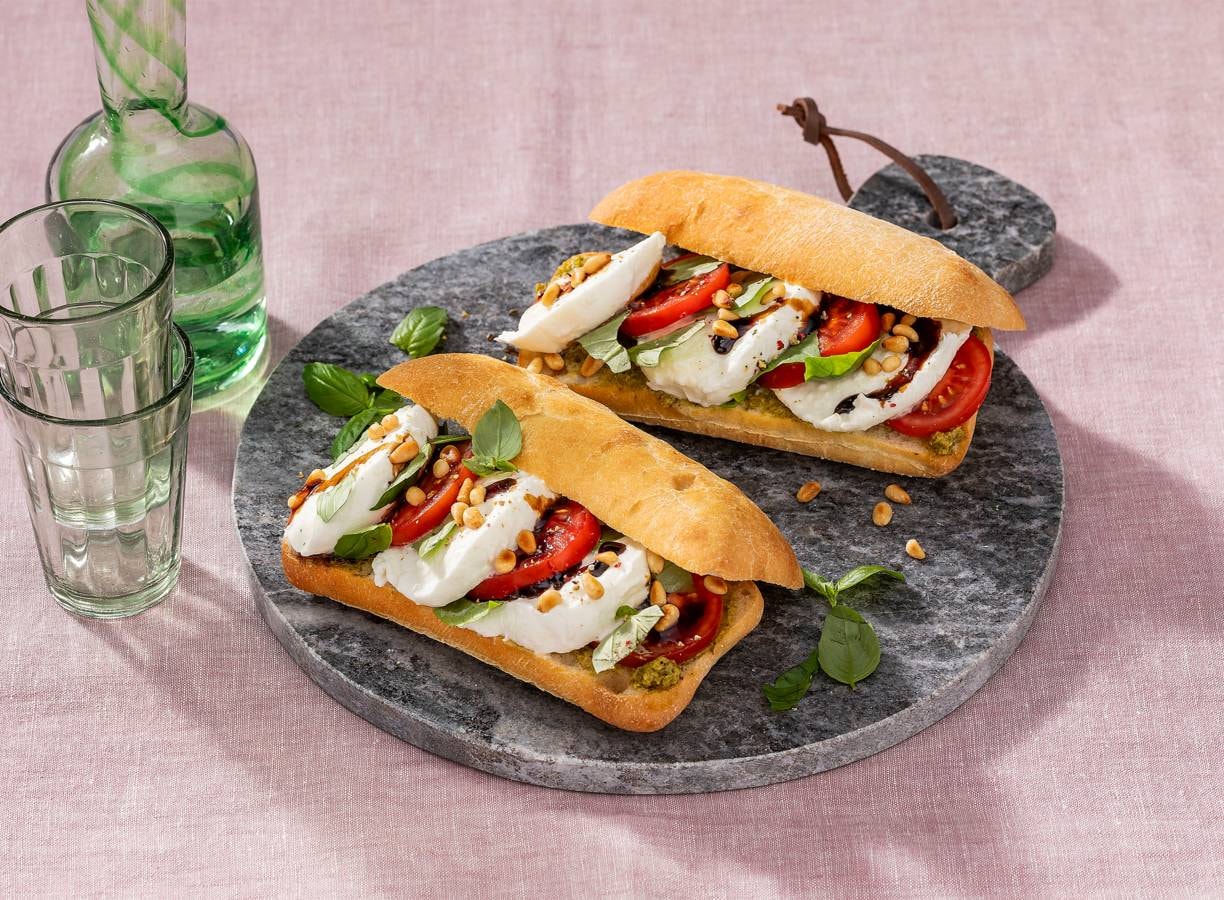 Snijd de broodjes open, besmeer de onderkanten met de pesto en beleg dakpansgewijs met de tomaat en mozzarella. Bestrooi met de basilicum en pijnboompitten. Besprenkel met cremaceto balsamico en breng op smaak met peper en eventueel zout.