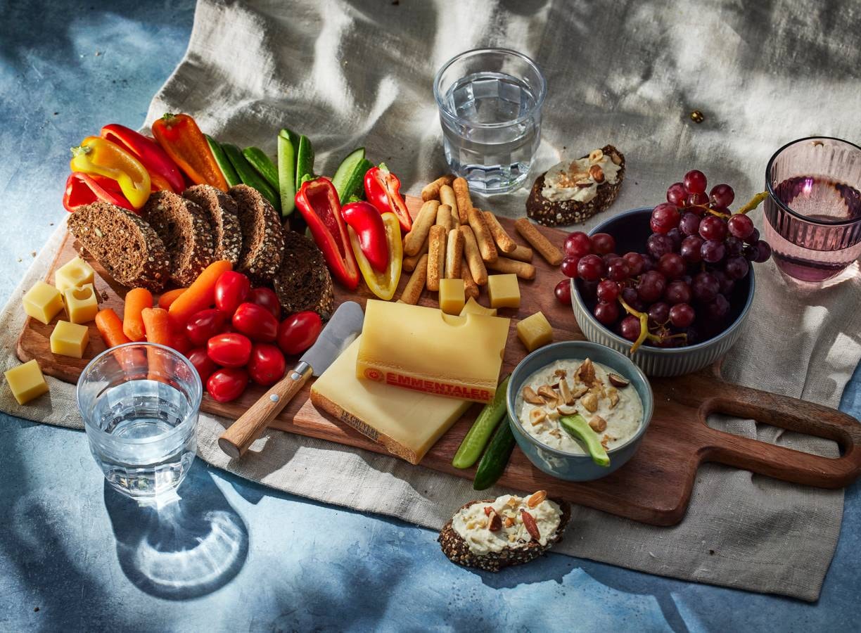 Zo makkelijk kan een borrelplank zijn: Gruyère en Emmentaler als middelpunt en erom fruit en groentjes. Dips, brood en krokantjes erbij. Snacken maar!