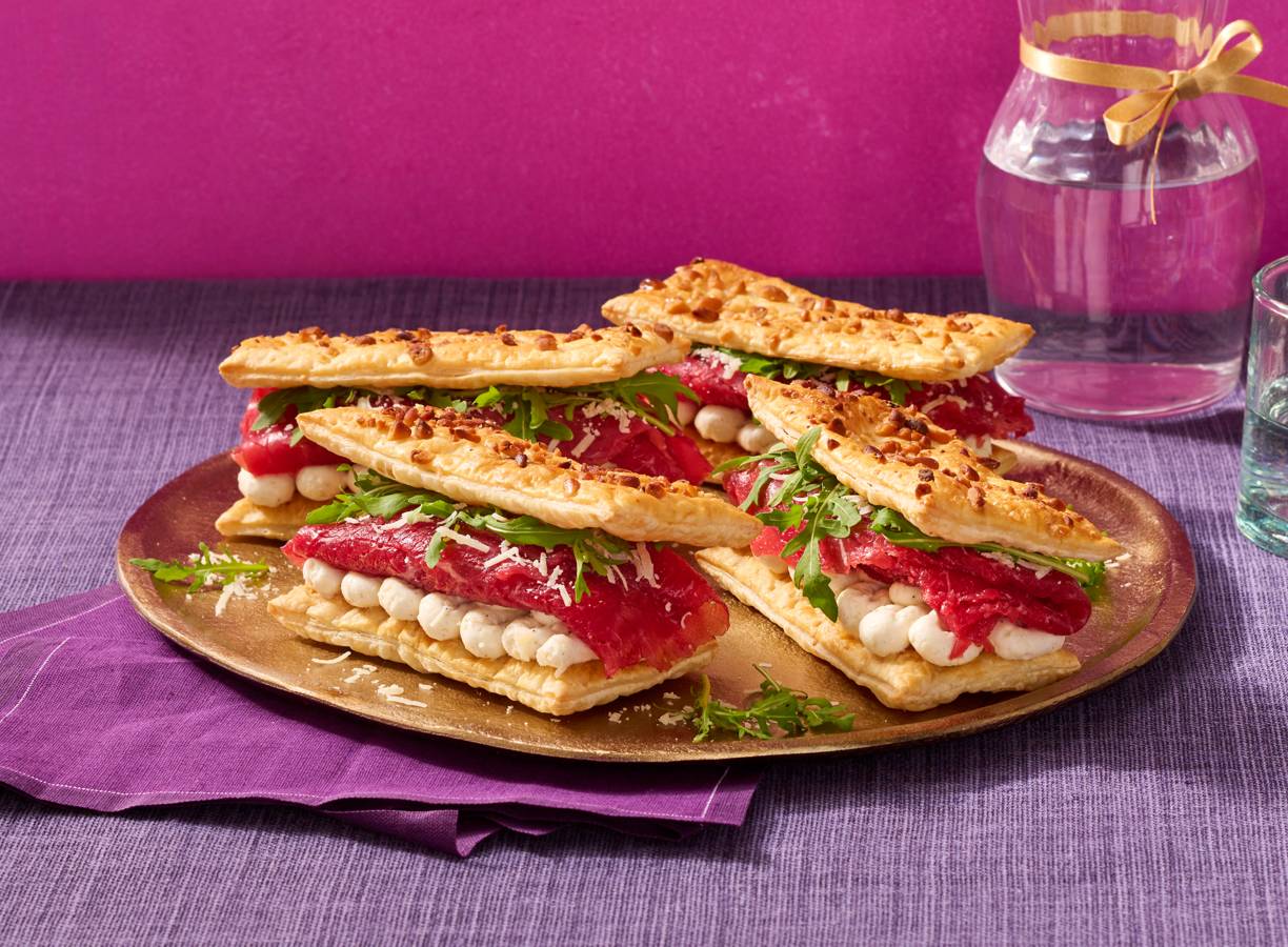 Deze hartige tompouce is de ster van jouw volgende diner! Knapperig bladerdeeg, romige kaas en carpaccio. Feestelijk op je bord voor het oog, maar vooral ook heel smakelijk.