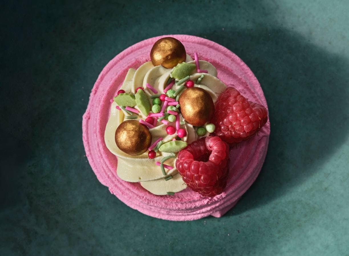 Spuit de pistachemousse over de mini pavlova’s en verdeel de frambozen en gouden parels erover. Bestrooi met de strooimix.