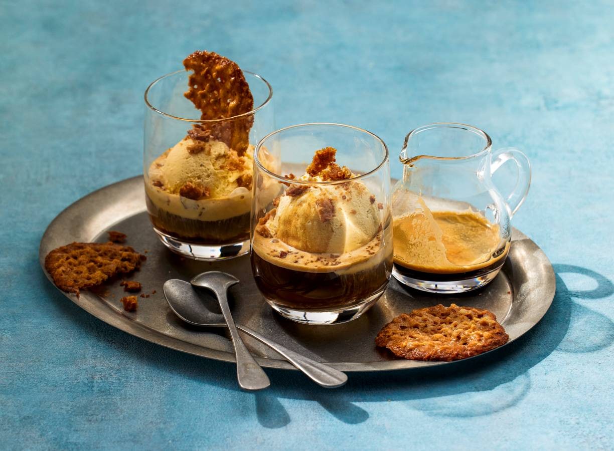 Een Italiaanse klassieker met een Nederlandse klassieker: een affogato (vanille-ijs met espresso) met kletskoppen. Die laatste zorgen voor een fijne zoete crunch boven op de warm/koud combi van het ijs en de koffie.