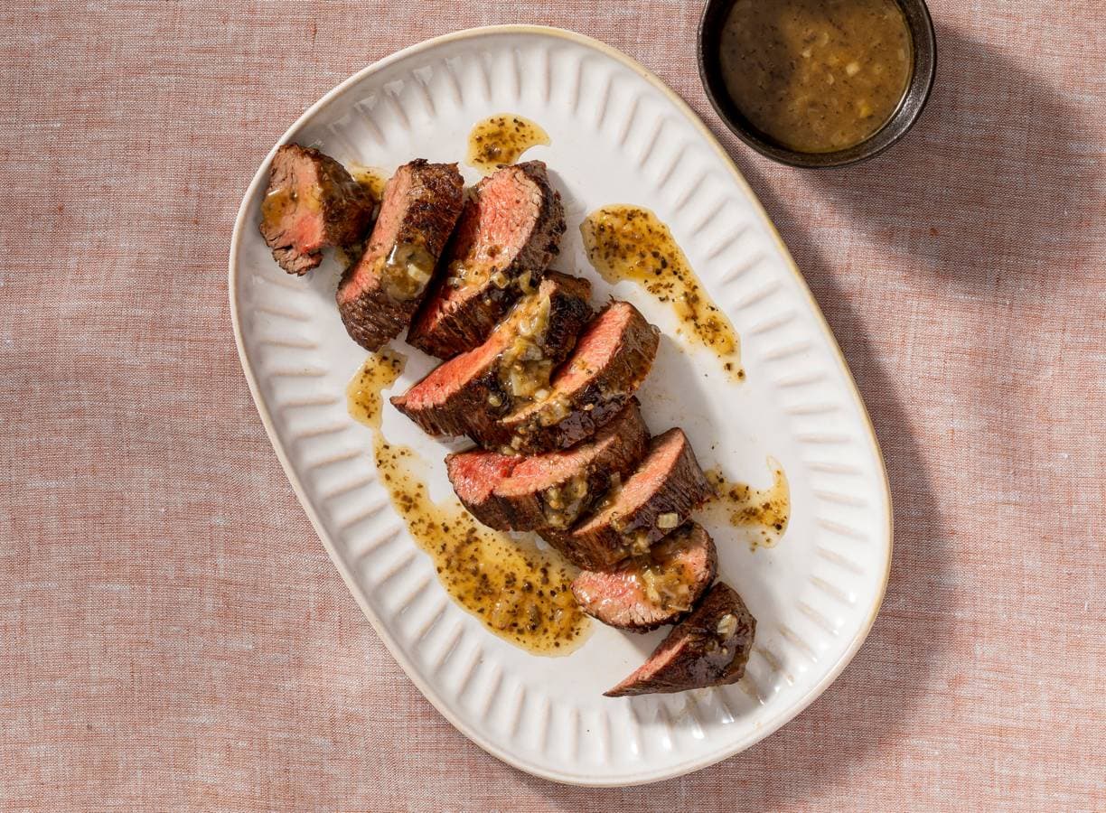 Voeg ⅓ van de roomboter toe aan de koekenpan en draai het vuur uit. Wentel de diamanthaas nog 1 min. door de boter. Leg het vlees op een bord en schenk het achtergebleven bakvet erover. Laat losjes afgedekt met aluminiumfolie 5 min. rusten.