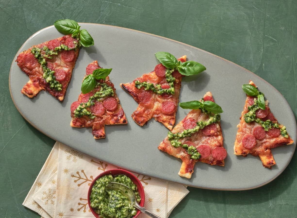 Wat zijn je takken wonderschoon... en om op te eten! Met deze kerstboompizza's heb je in een handomdraai een feestelijk hapje op tafel.