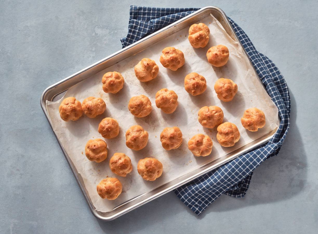 Verwarm de oven voor op 190 °C. Verwarm de melk met het water in een steelpan op middelhoog vuur. Voeg de boter toe en verwarm tot de boter gesmolten is. Voeg het meel, de suiker en het zout toe. Roer door met een spatel tot het meel is opgenomen.