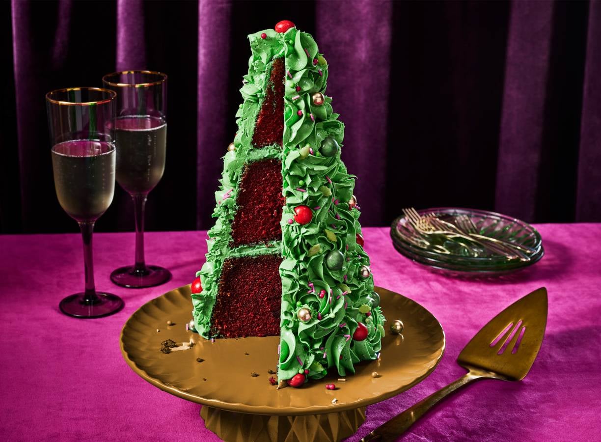 Hoe leuk: deze red velvet cake is vermomd als knalgroene kerstboom.