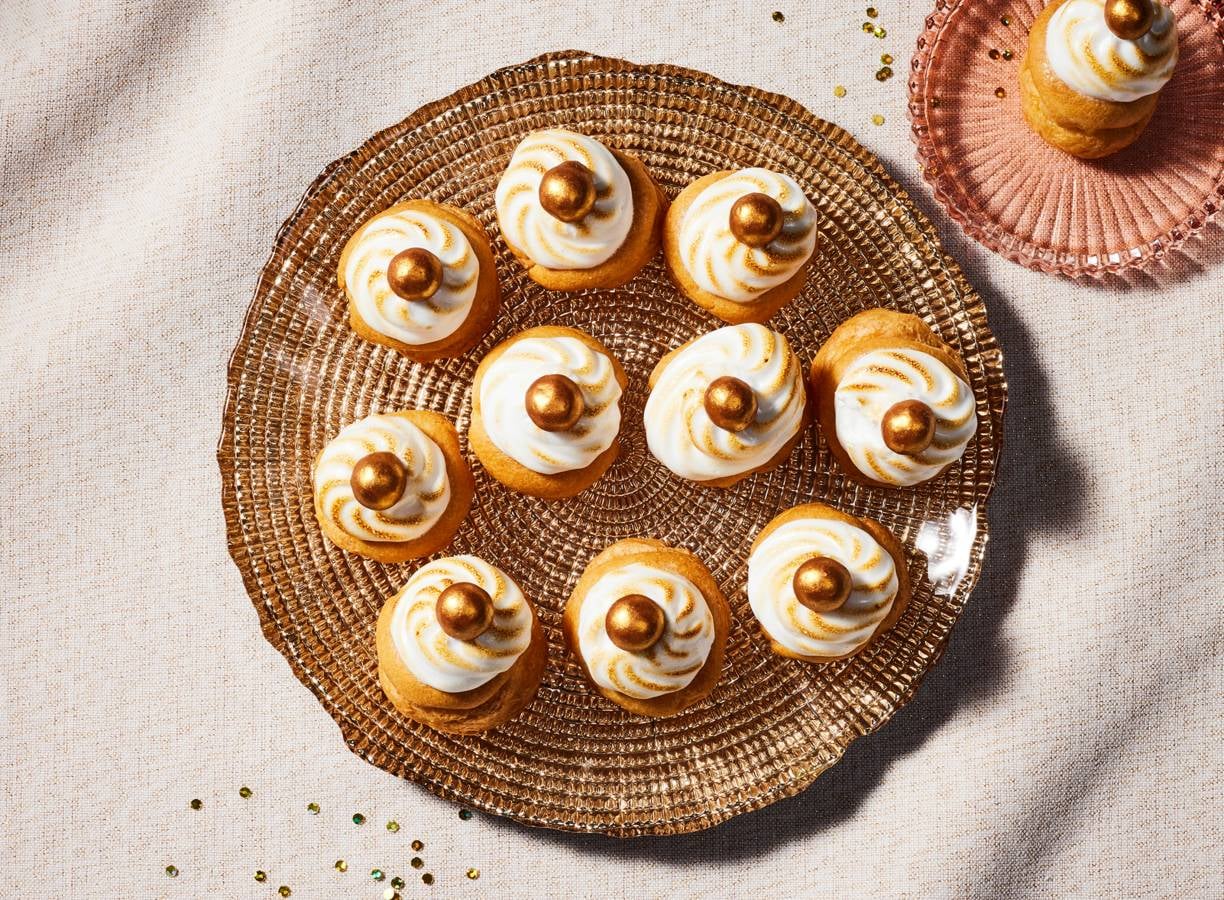 Vul de soezen met de passievruchtvulling. Spuit er toefjes meringue op, brand met de brûléebrander en verdeel de parels erover. Verdeel de soezen over de etagère.