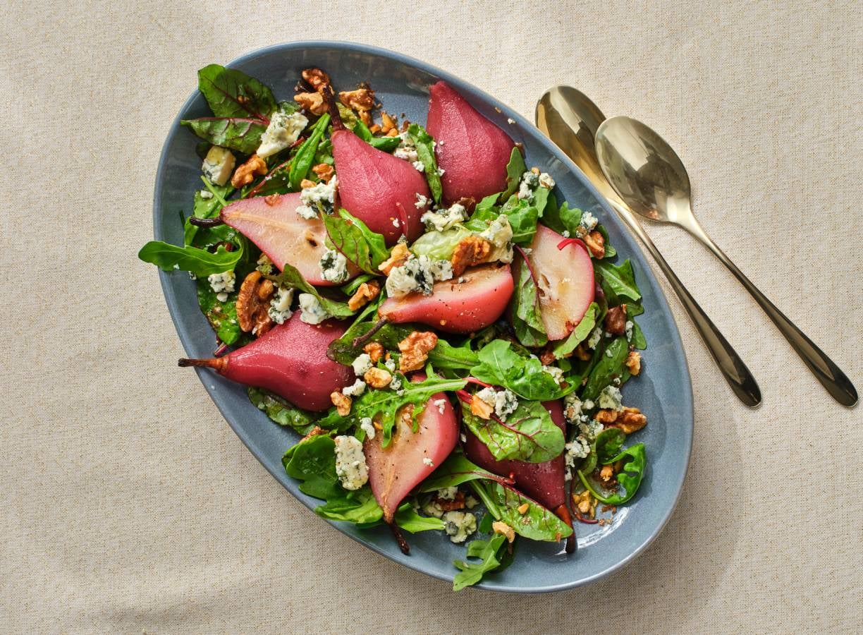 Deze verrassende salade combineert je vertrouwde, zoete stoofpeertjes met pittige blauwe kaas. Een gouden combi!