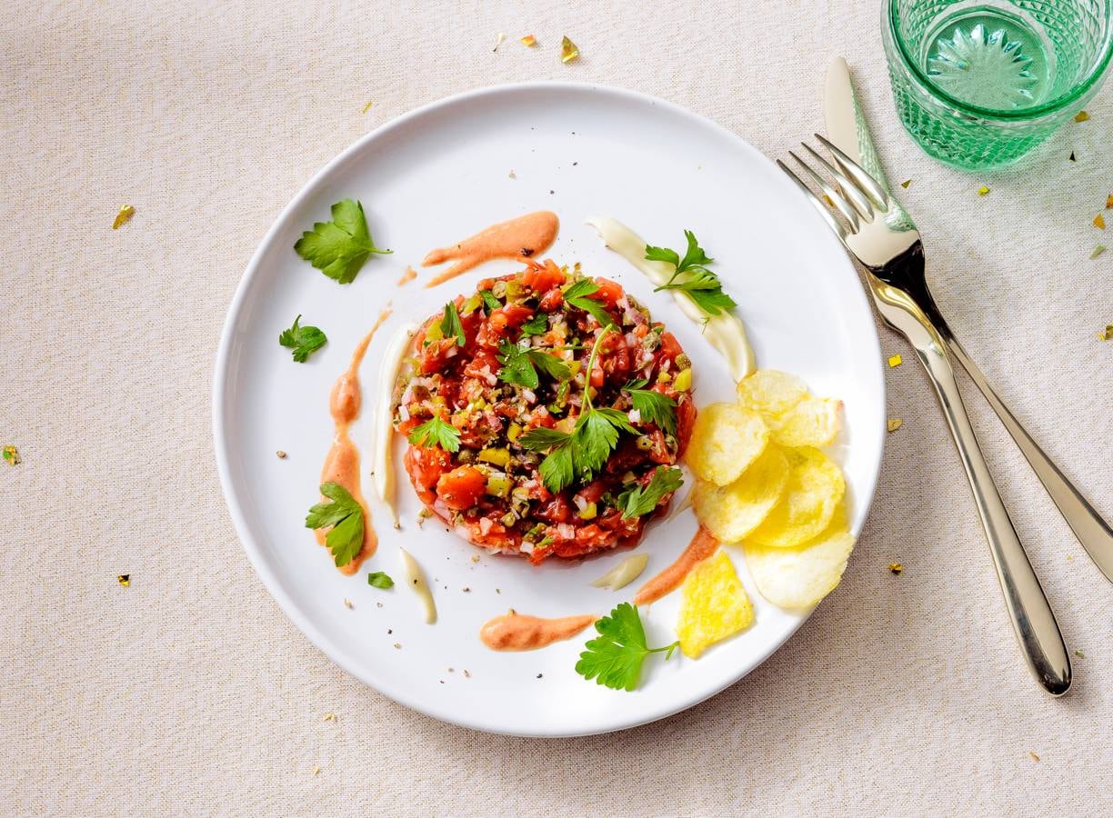 Gepelde tomaten maken een perfecte vegaversie van steak tartaar, zeker met deze klassieke smaakmakers erdoor wordt het een fijn voorgerecht.