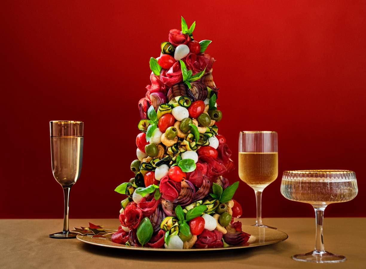 serveertip:Als je geen serveertoren hebt, serveer de antipasti dan in een kransvorm of op een grote serveerschaal. Je kunt de kerstboom ook maken met een grote spitskool als basis. Snijd een stukje van de onderkant recht af voor een stabiele bodem. Pak de spitskool in met aluminiumfolie en prik alles erop volgens het recept. Maak een stoof of soep van de spitskool.