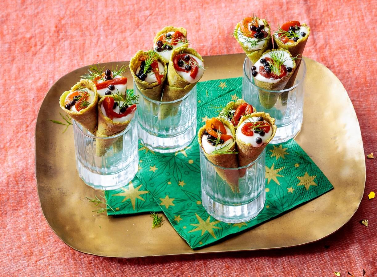 Whipped feta-hoorntjes met paprika en balsamicoparels