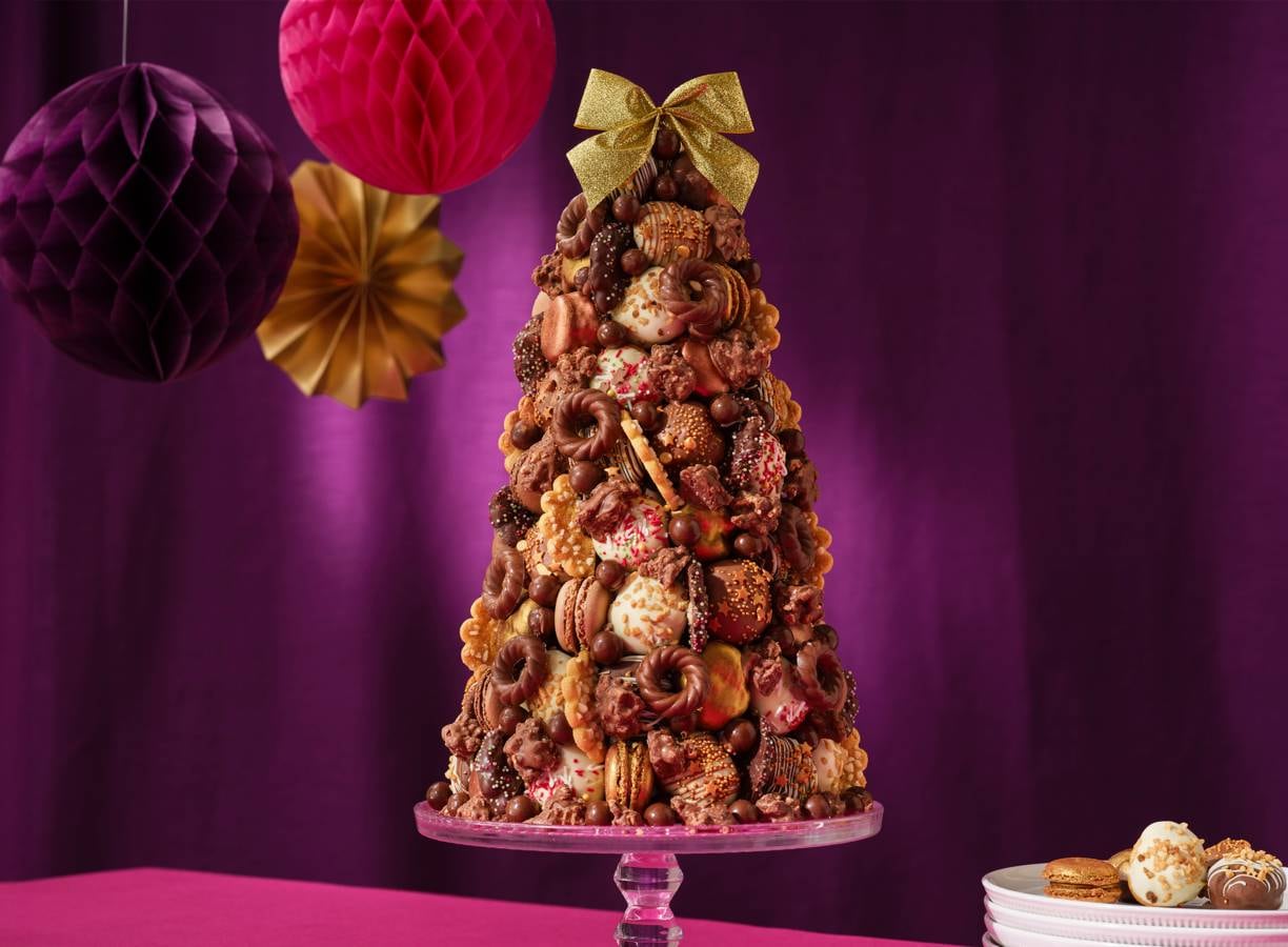 Deze chocolade-soezenkerstboom is een kunstwerk van een kersttoetje. Rijkelijk versierd met soesjes, chocolade, macarons, vers fruit en feestelijke parels. De ideale afsluiter van het kerstdiner.