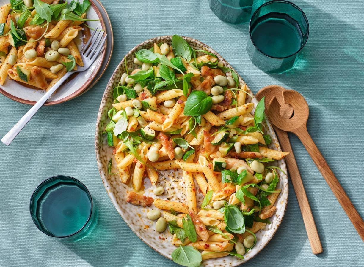 Tuinbonen zijn zacht en vol van smaak en combineren perfect met courgette, basilicum en arrabbiata-pesto in deze pasta.