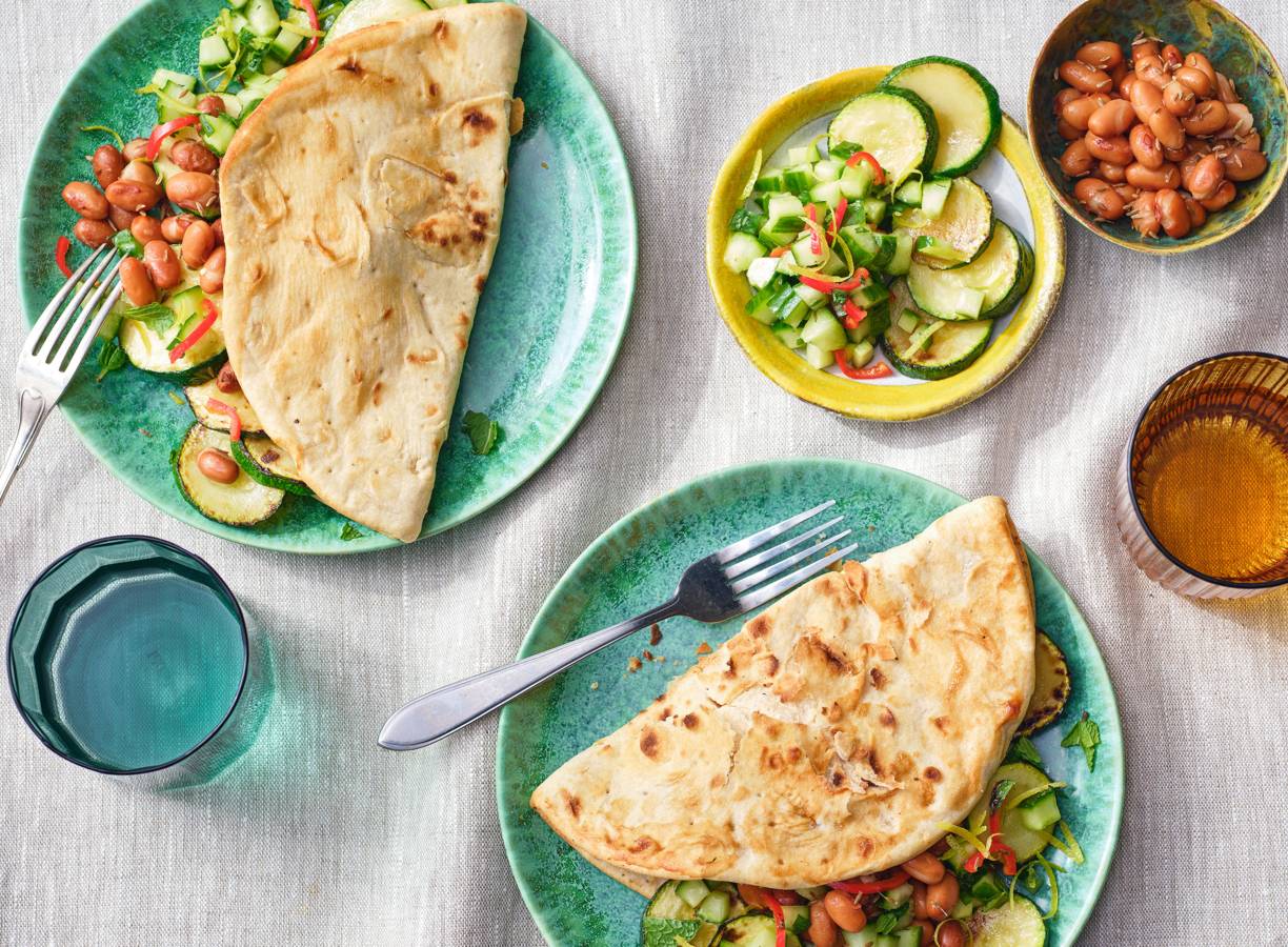 Flatbread met gebakken bruine bonen en komkommersalsa