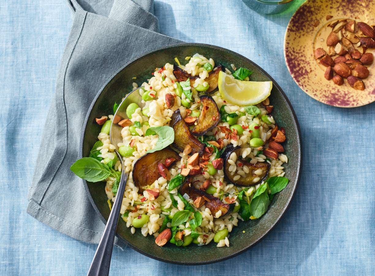 Orzo met edamame en geroosterde aubergine