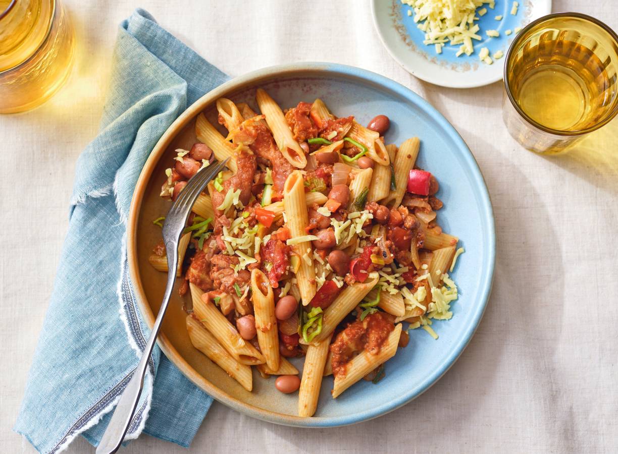 Lekker snel, deze pittige pasta met chilibonen! En door de plantaardige rasp en rulgehakt is deze penne ook nog eens helemaal vegan.