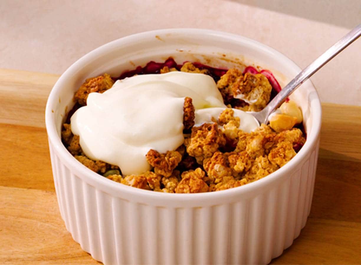 Op zoek naar een go-to herfstontbijt? Probeer deze crumble met peer, bramen en cruesli. Eet smakelijk!