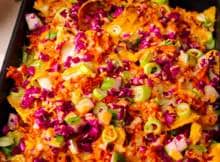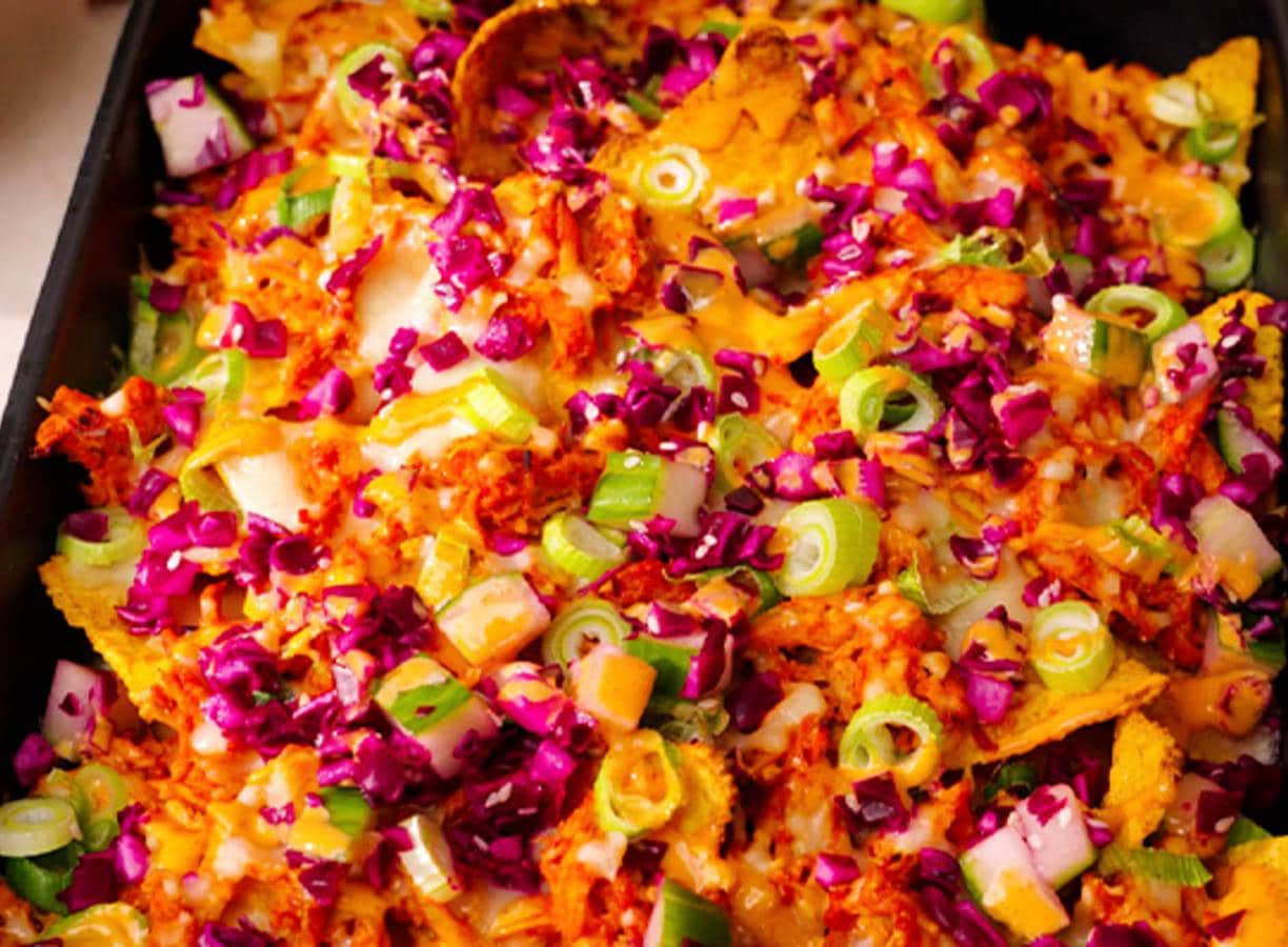 Gochujang + loaded nacho's = een droom duo. Deze spicy Korean chicken nacho's móét je proberen!