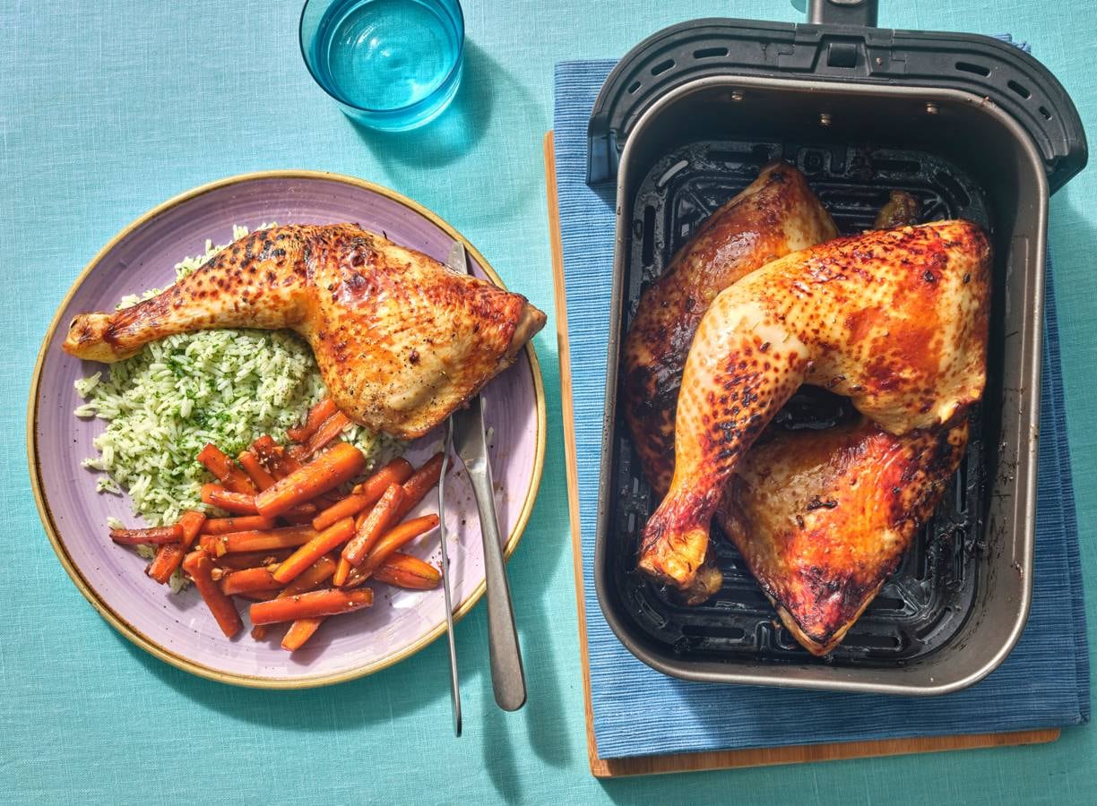 Kiplekker uit de airfryer: gemarineerde kippenbouten van London Loy. Serveer met een zelfgemaakte kruidenrijst en roergebakken peen.