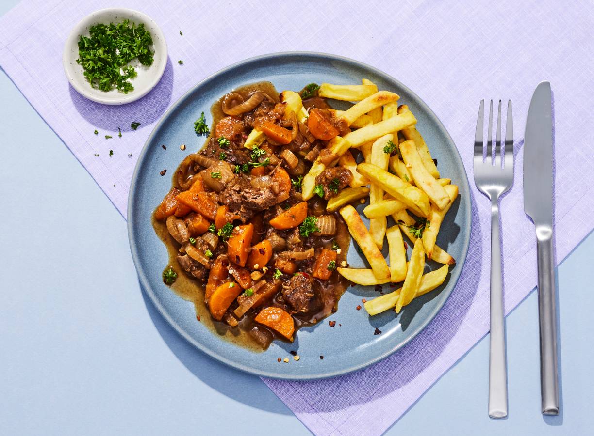 Comfortfood maar dan gezond: dit stoofvlees met friet uit de airfryer! Het smeuïge stoofvlees en de zachte groente met de knapperige frietjes zal iedereen laten smullen aan de eettafel.