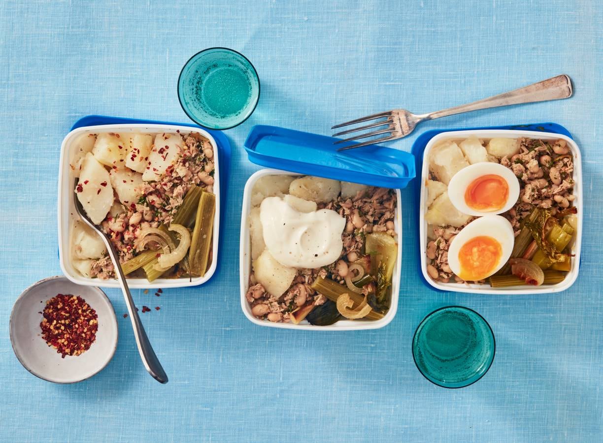 bewaartip:Bewaar de aardappelen, tonijn-bonensalade en geroosterde groenten in aparte bakjes max. 3 dagen in de koelkast.