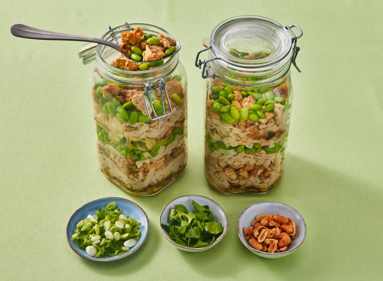 Verdeel de noedels, tofu, geroosterde groenten en edamamebonen over de glazen potten of bakjes.