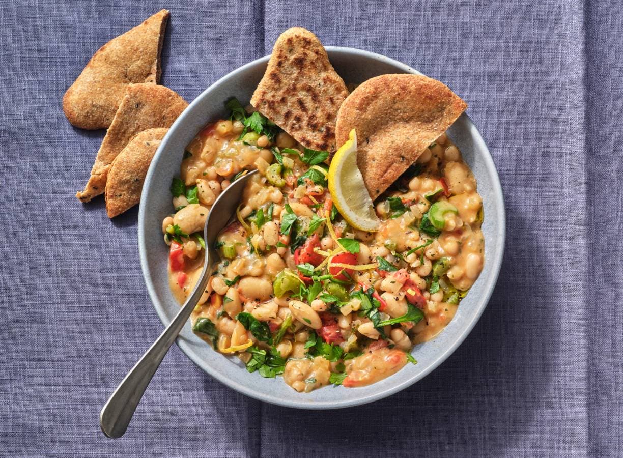 Voor dit gezonde gerecht wil je altijd een blik limabonen en witte bonen in de kast hebben staan. Deze romige stoof boordevol groente en peulvruchten serveer je met volkorennaan voor een voedzame en vullende maaltijd.