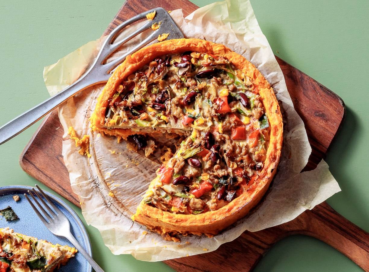 Wist je dat je het deeg van een hartige taart kan vervangen door zoete aardappelpuree? Het is de fijne bodem voor deze gezonde taart met een vulling van kipgehakt, 'Mexicaanse' wokgroente en picadillo.