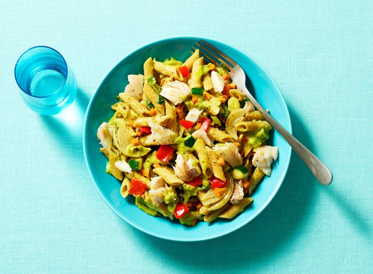 Deze gezonde pasta met koolvis en een romige avocadosaus zet je al in een handomdraai op tafel.