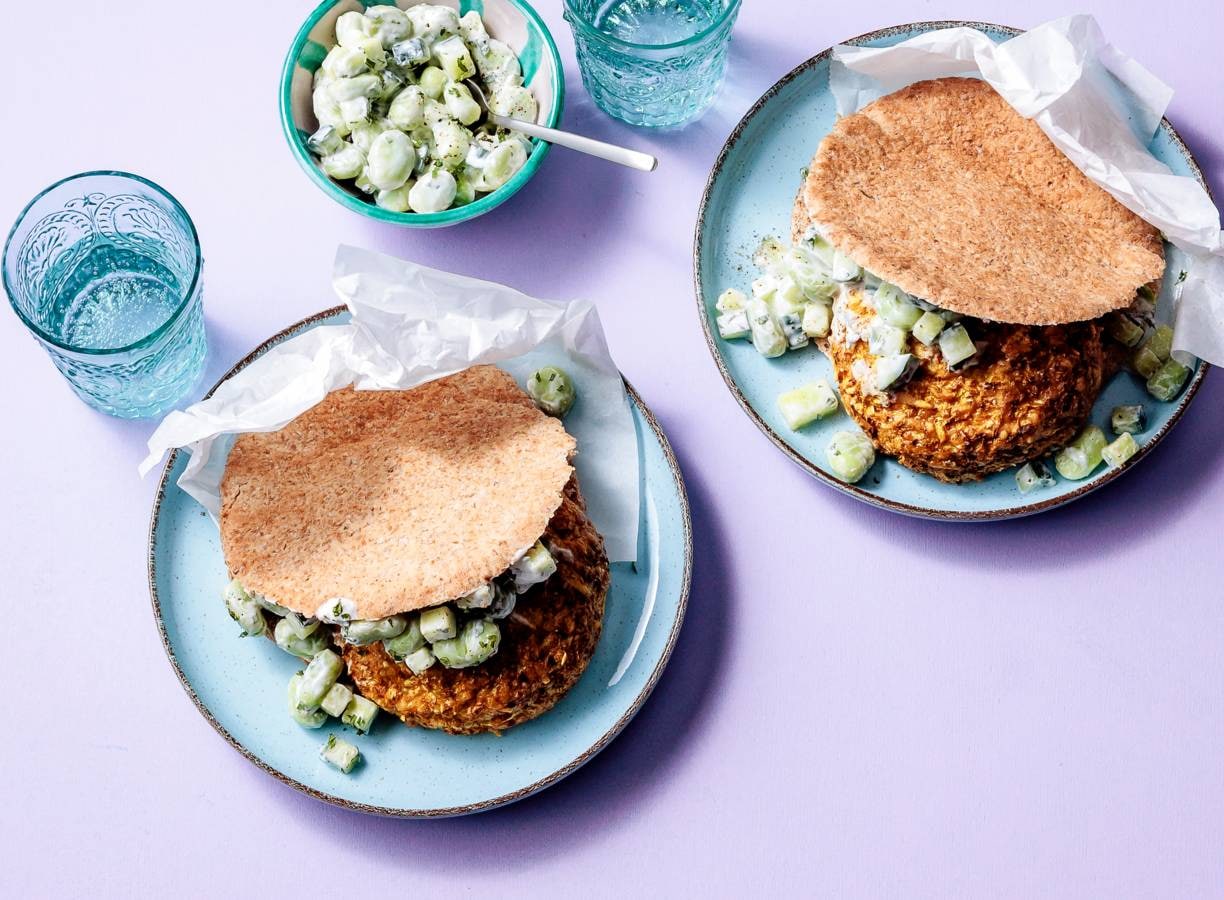 Met bloemkoolrijst, kaas, volkorenmeel, eieren en masalakruiden maak je eenvoudig deze gezonde bloemkoolburgers. Lekker in een pita met een tuinbonensalade en frisse yoghurt-muntsaus.