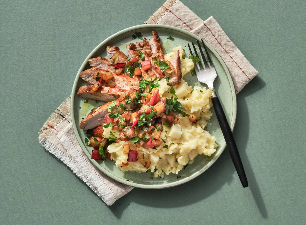 Verdeel de stamppot met de blokjes pastinaak, het ui-appelmengsel en het vlees over borden.