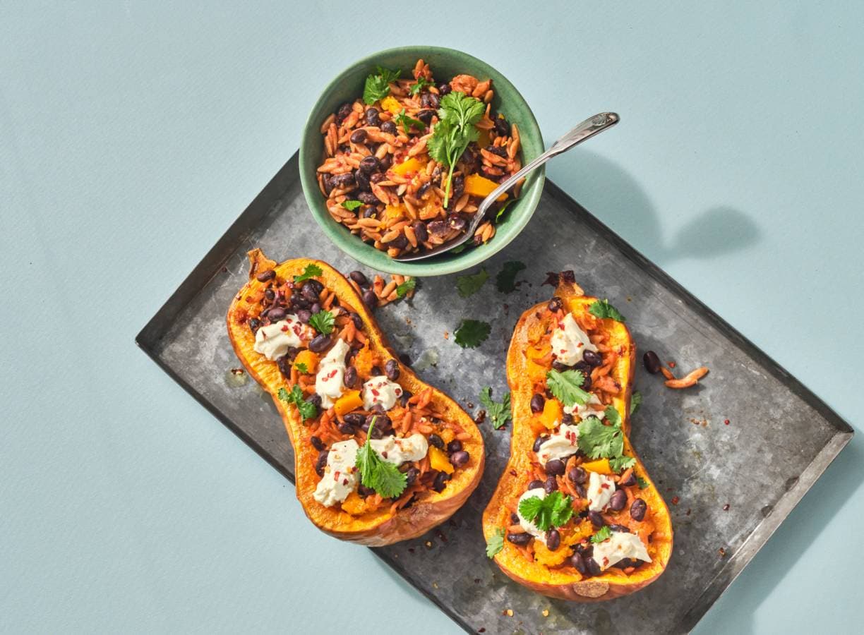 Gezond eten hoeft niet saai te zijn. Kijk maar naar deze prachtige pompoen gevuld met orzo en zwarte bonen in een romige saus van zuivelspread.