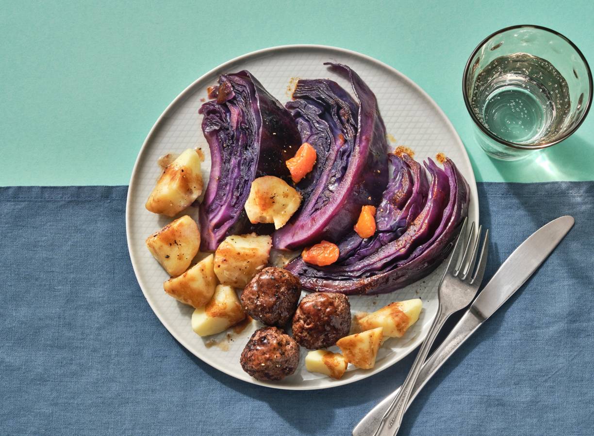 Verdeel de aardappelen, kool en balletjes over de borden.
