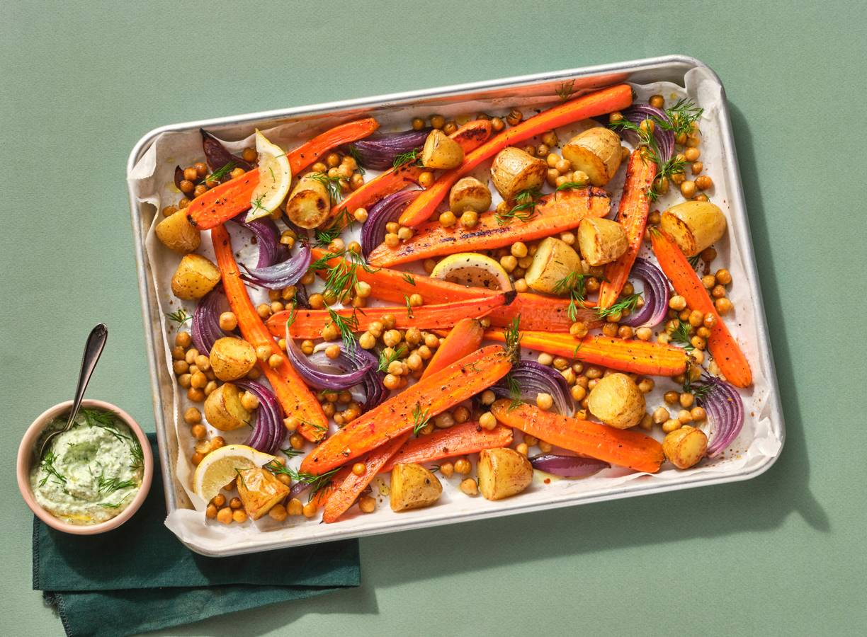 Traybakes zijn niet alleen erg makkelijk maar ook erg lekker. Geroosterde winterpeen, opgeklopte cottagecheese, dit is een heerlijk gezonde maaltijd.