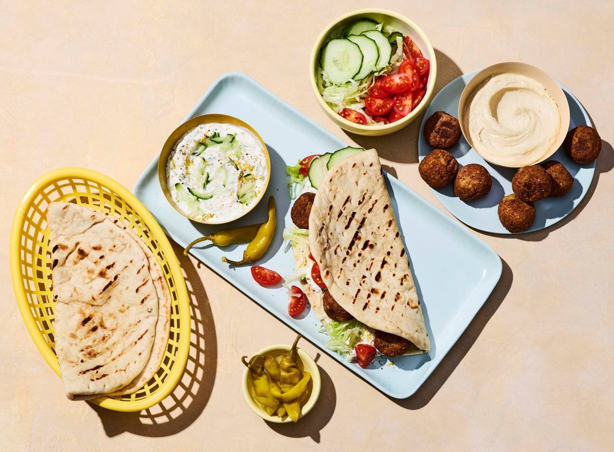 Zet de flatbreads samen met de yoghurtsaus, falafel, komkommer, tomaat, ijsbergsla, ingelegde groene peper en hummus in bakjes op tafel en laat iedereen zijn eigen broodje maken.