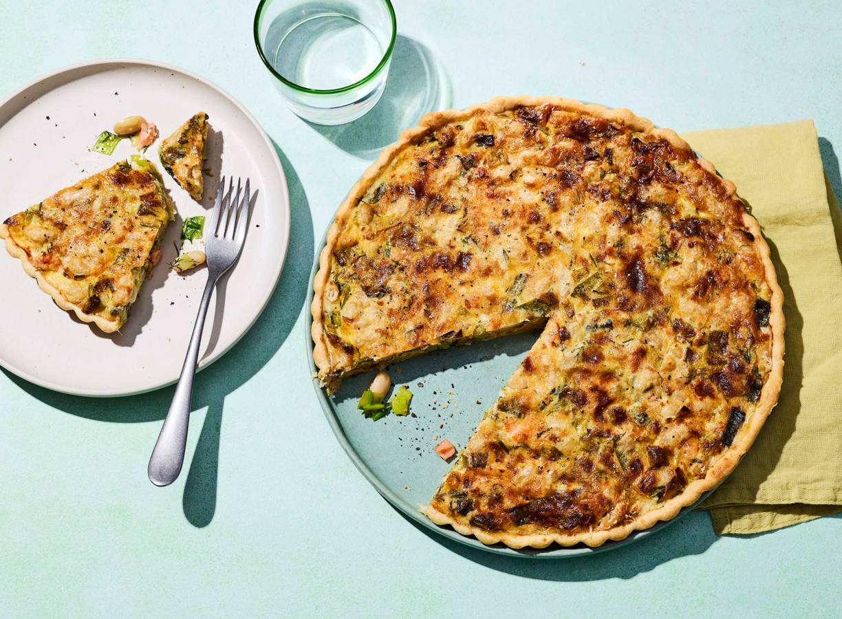 Verwarm de oven voor op 190 °C. Bekleed de quichevorm met het deeg en prik met een vork gaatjes in de bodem. Bekleed het deeg met bakpapier en verdeel de blindbakbonen erover. Bak het deeg 15 min. in de oven. Verwijder de bakvulling en het bakpapier en bak de bodem nog 8 min.