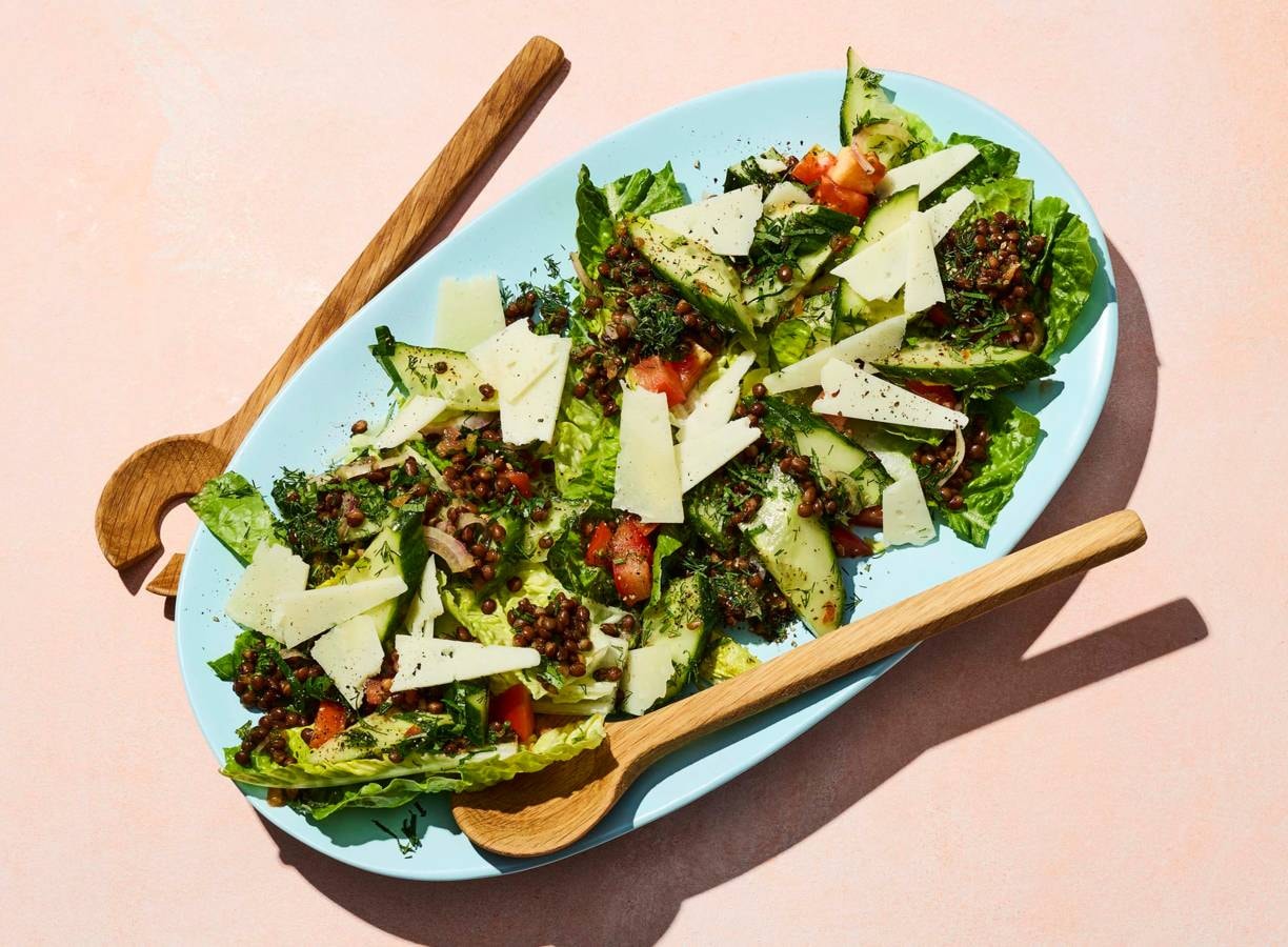 Meng de komkommer met de tomatenblokjes, sla, verse kruiden, linzen, het sjalot-tomatenmengsel en de olie. Breng op smaak met peper en eventueel zout. Verdeel over een schaal en schaaf de manchego erboven.