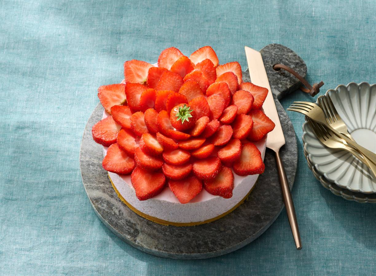 Luchtige aardbeienbavarois op een krokante bodem. Want waarom zou je van een klassiek Frans dessert eigenlijk niet een taart maken? Justement.