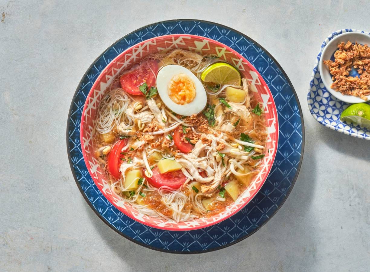 Met een boemboe voeg je in één keer bakken smaak toe aan je gerecht, zoals aan deze soto met noedels, aardappel en tomaat.