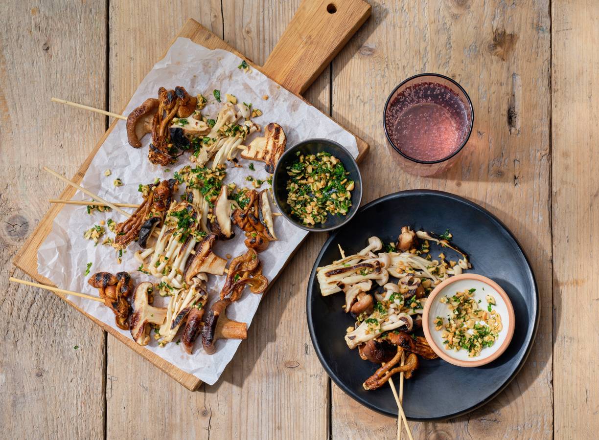 Gek op paddenstoelen van de BBQ? Probeer deze gegrilde-paddenstoelen-spiesjes geserveerd met kruiden-knoflookcrunch: een mix van knoflook, pinda, kruiden en citroen. Dat is smaakvol en geeft een lekkere crunch!