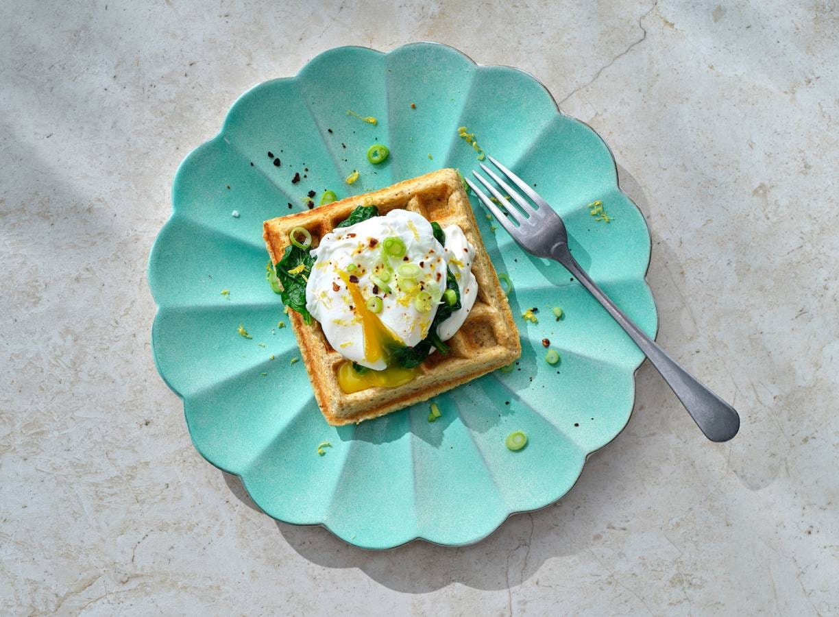 Ook glutenvrij zet je een heerlijke brunch op tafel. Ga voor deze glutenvrije wafels met roomkaas, spinazie, een gepocheerd eitje en bosui!
