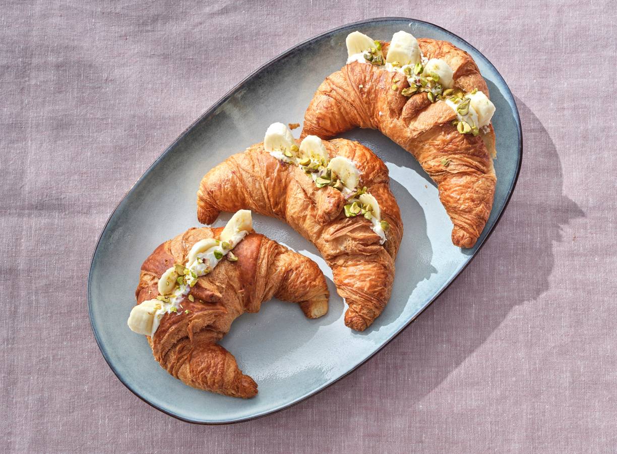 Croissant-fan? Deze goedgevulde roombotercroissant met roomkaas, banaan, karamelsaus en pistache moet je proberen. Je hoeft 'm alleen te vullen en dan kun je aanvallen!