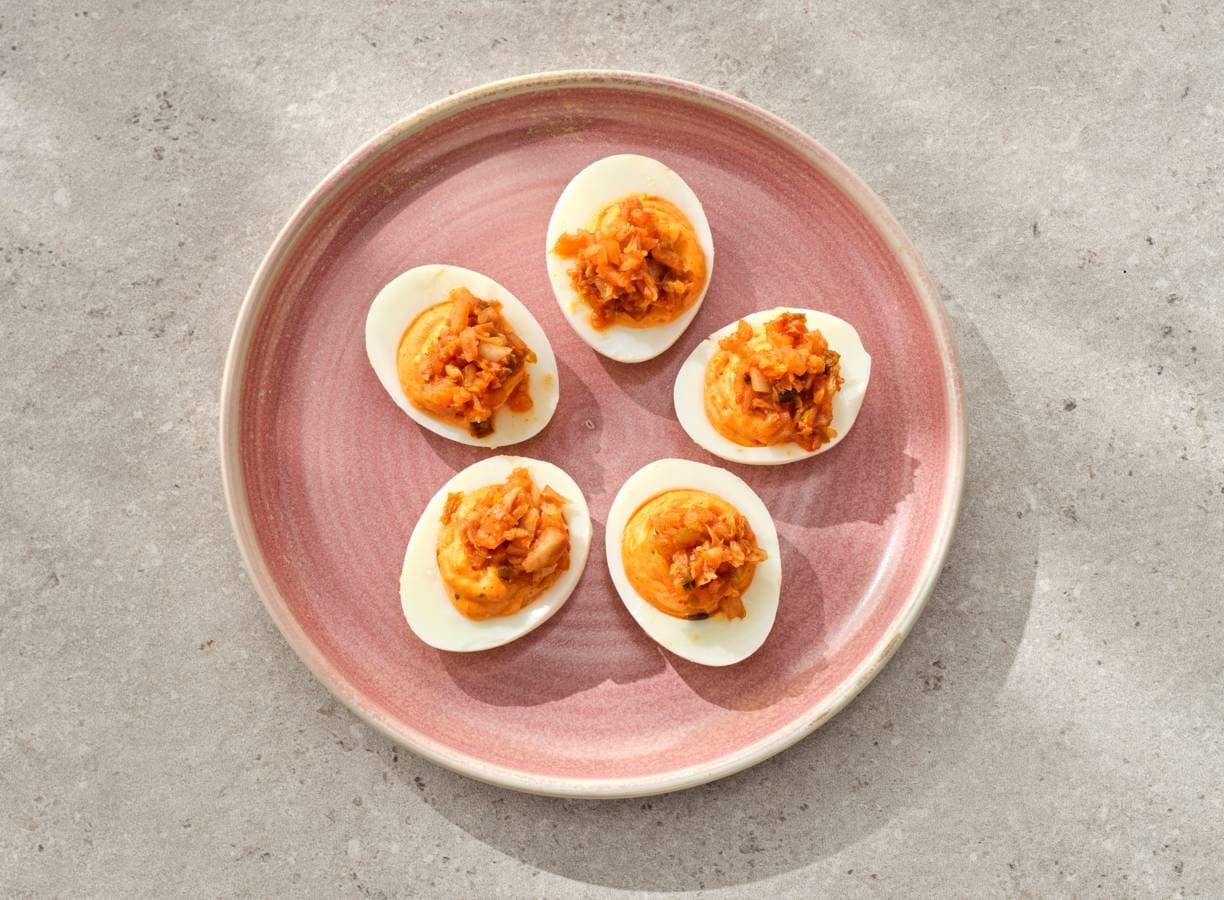 Geef je gevulde eieren een twist geïnspireerd op de Koreaanse keuken. De kimchi en gochujang geven de eitjes extra pit. Wij zijn er gek op!