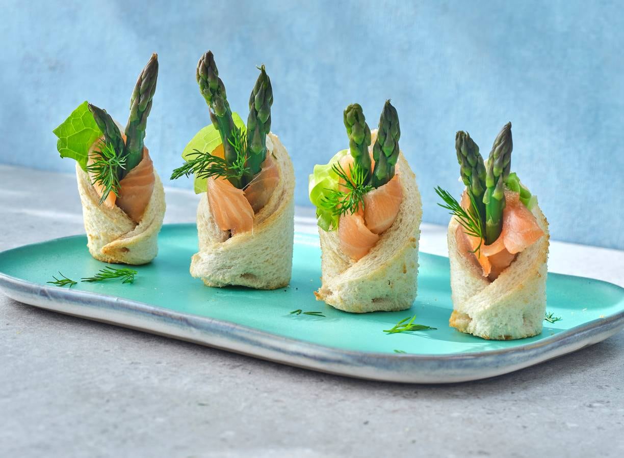 Besmeer elke broodenveloppe aan de binnenkant met de zuivelspread en beleg met wat sla, 2 stukjes aspergetips, de gerookte zalm en een takje dille.