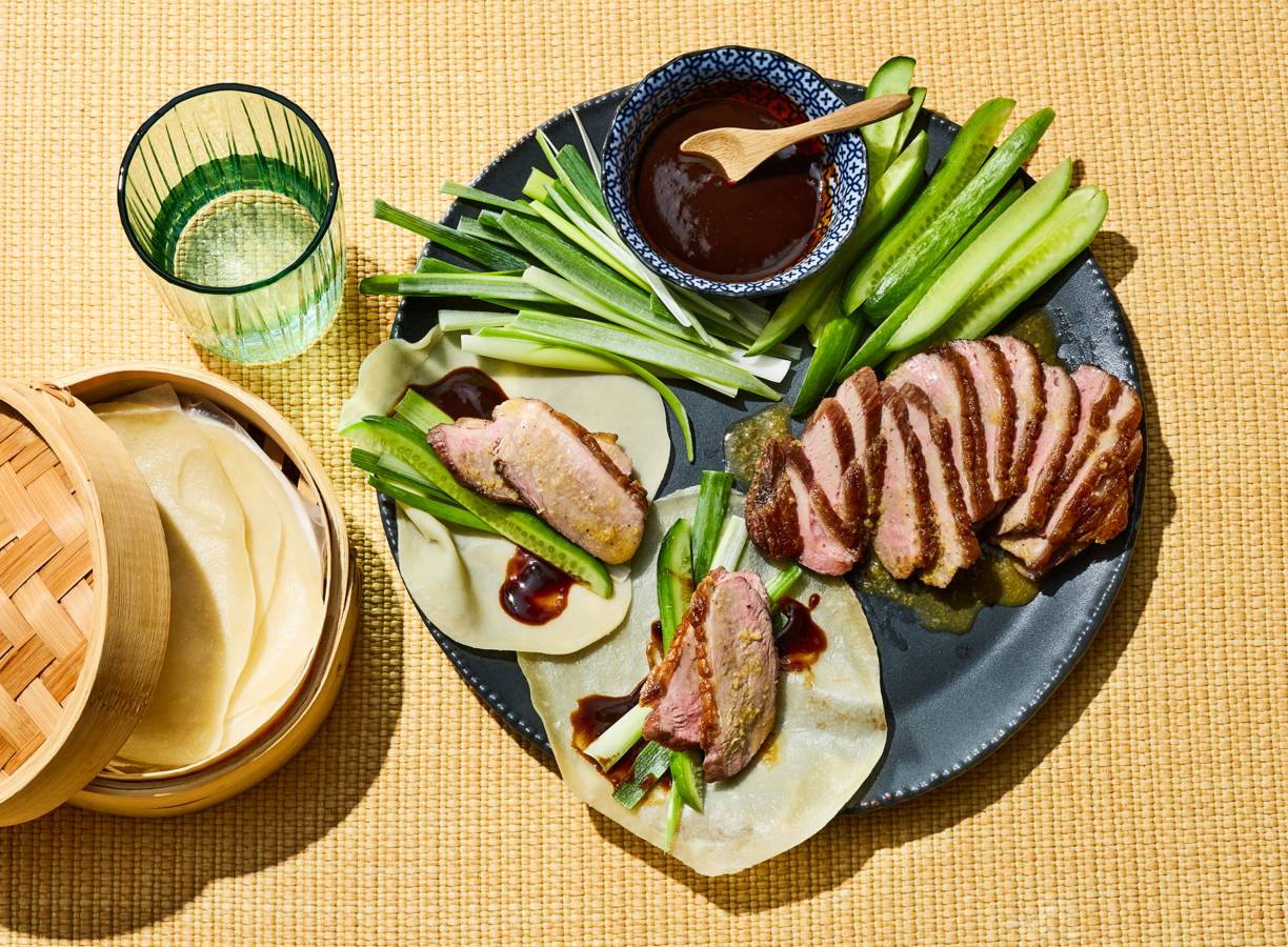 Gek op pekingeend? In dit recept met eendenborstfilet gebruik je dezelfde smaakmakers en maak je zelf de Chinese pannenkoekjes. Beleg ze met komkommer, bosui, de eend en hoisin en je hebt een heerlijk gerechtje voor bij de borrel of dimsum.